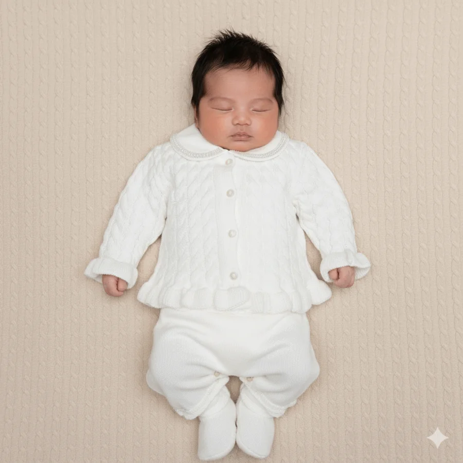 Jardineira e Casaquinho Folhagem Off-white – 2 peças