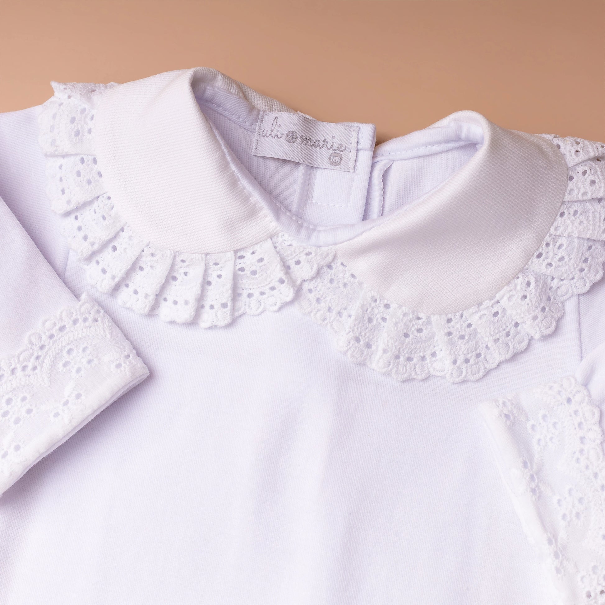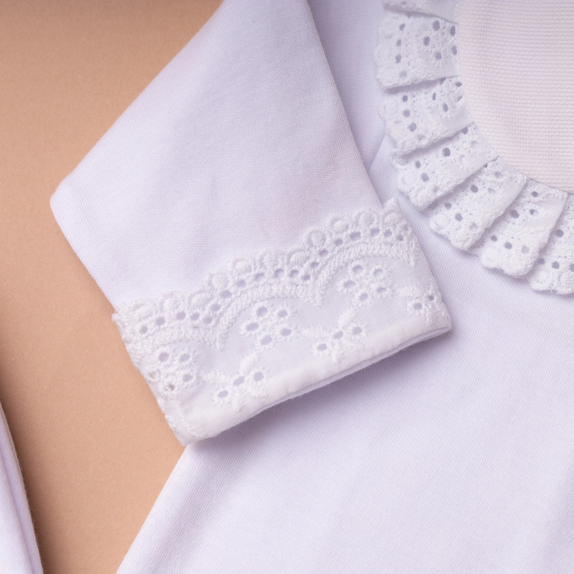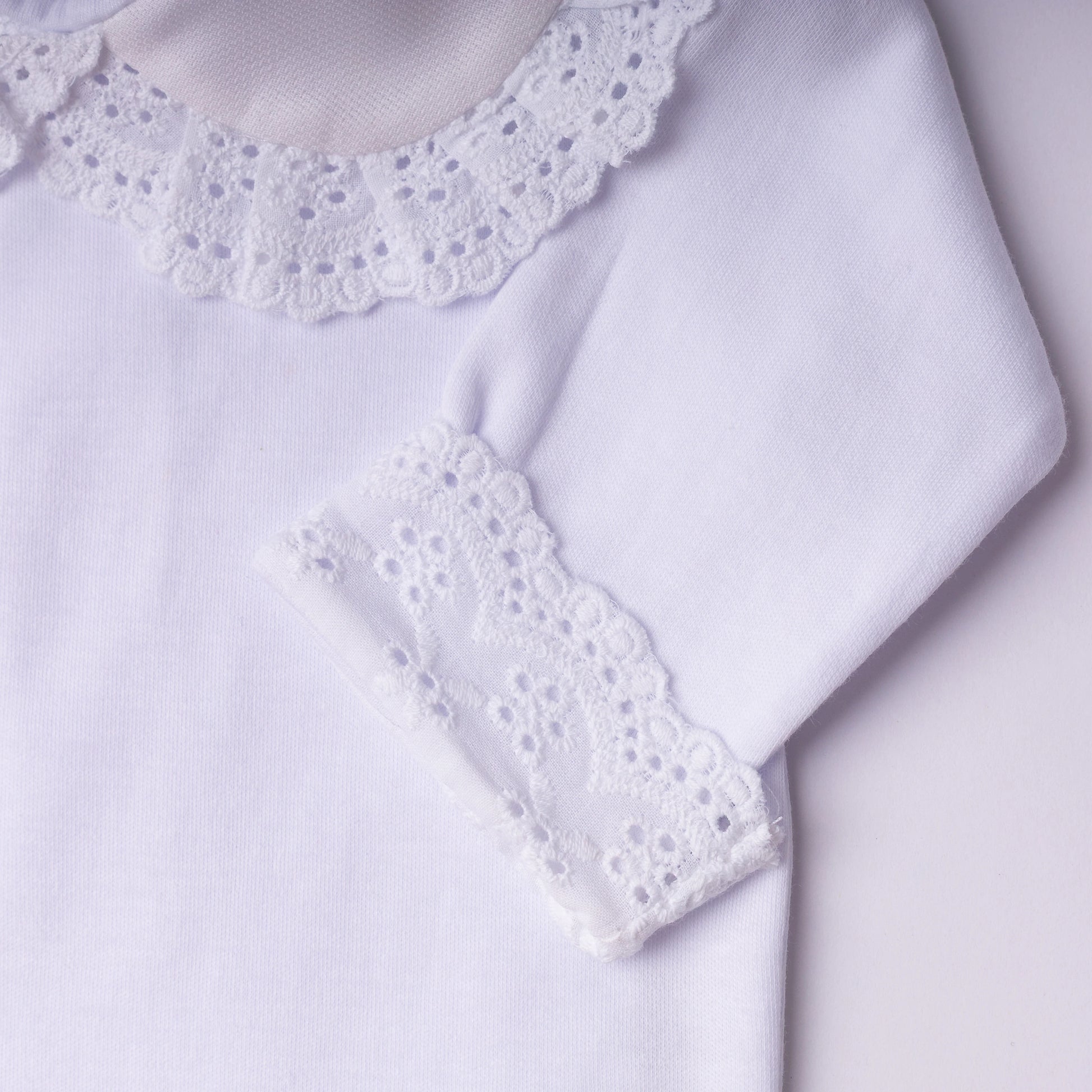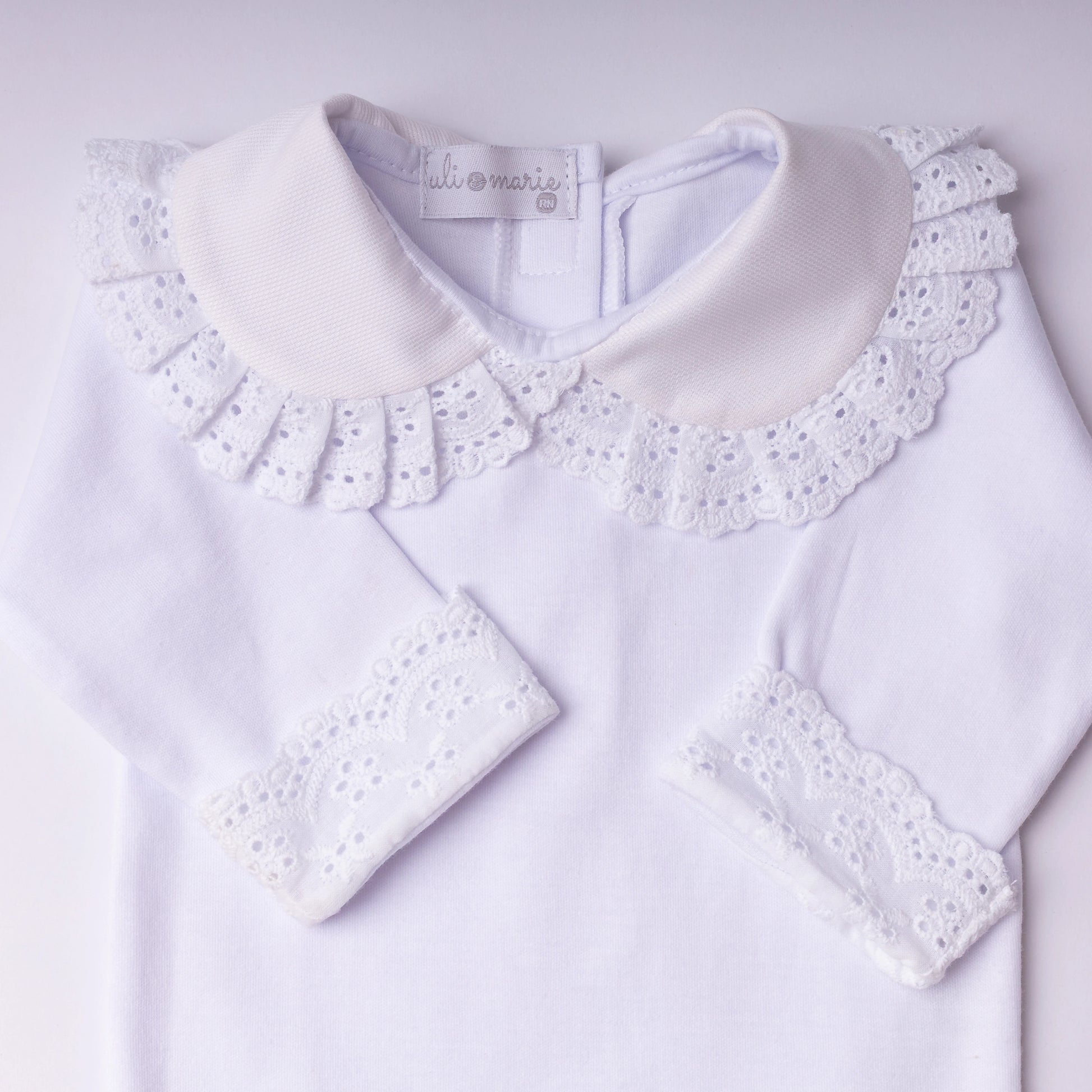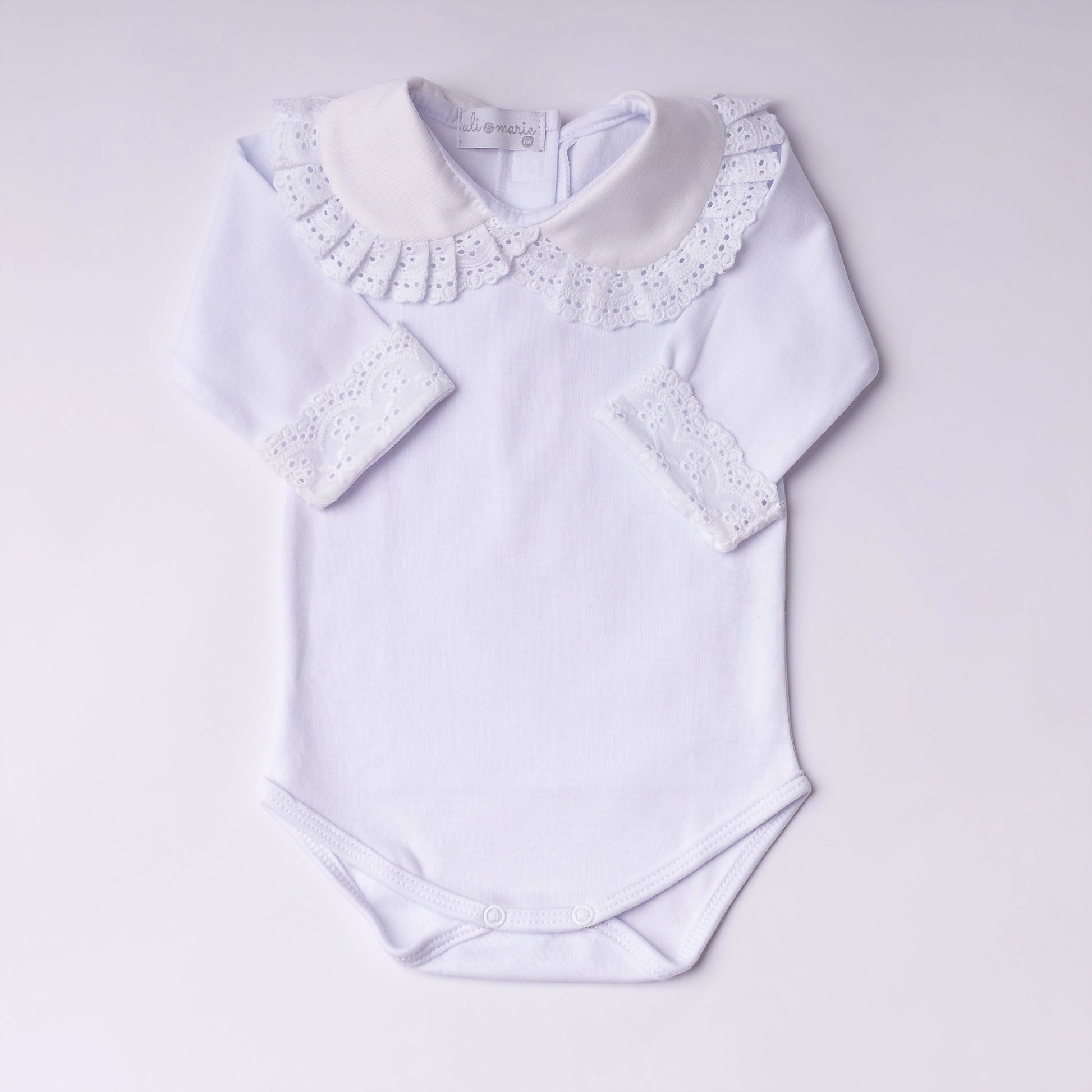 O Body Bordado Inglês na cor branca é confeccionado em algodão egípcio, garantindo um toque extremamente macio e confortável para a pele delicada do bebê. A peça apresenta um elegante detalhe em bordado inglês na gola e nos punhos, conferindo um acabamento sofisticado e delicado.