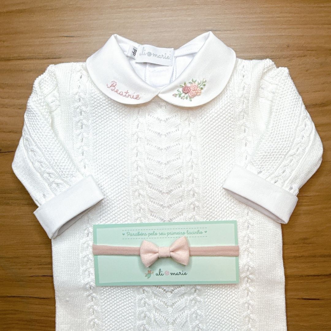 O Body Beatriz é uma peça delicada e exclusiva, confeccionada em Suedine 100% para proporcionar máximo conforto ao seu bebê. Com bordado floral artesanal em tons de rosa, verde e off-white, ele se destaca pelo acabamento refinado e pela personalização especial com o nome da bebê bordado na gola.