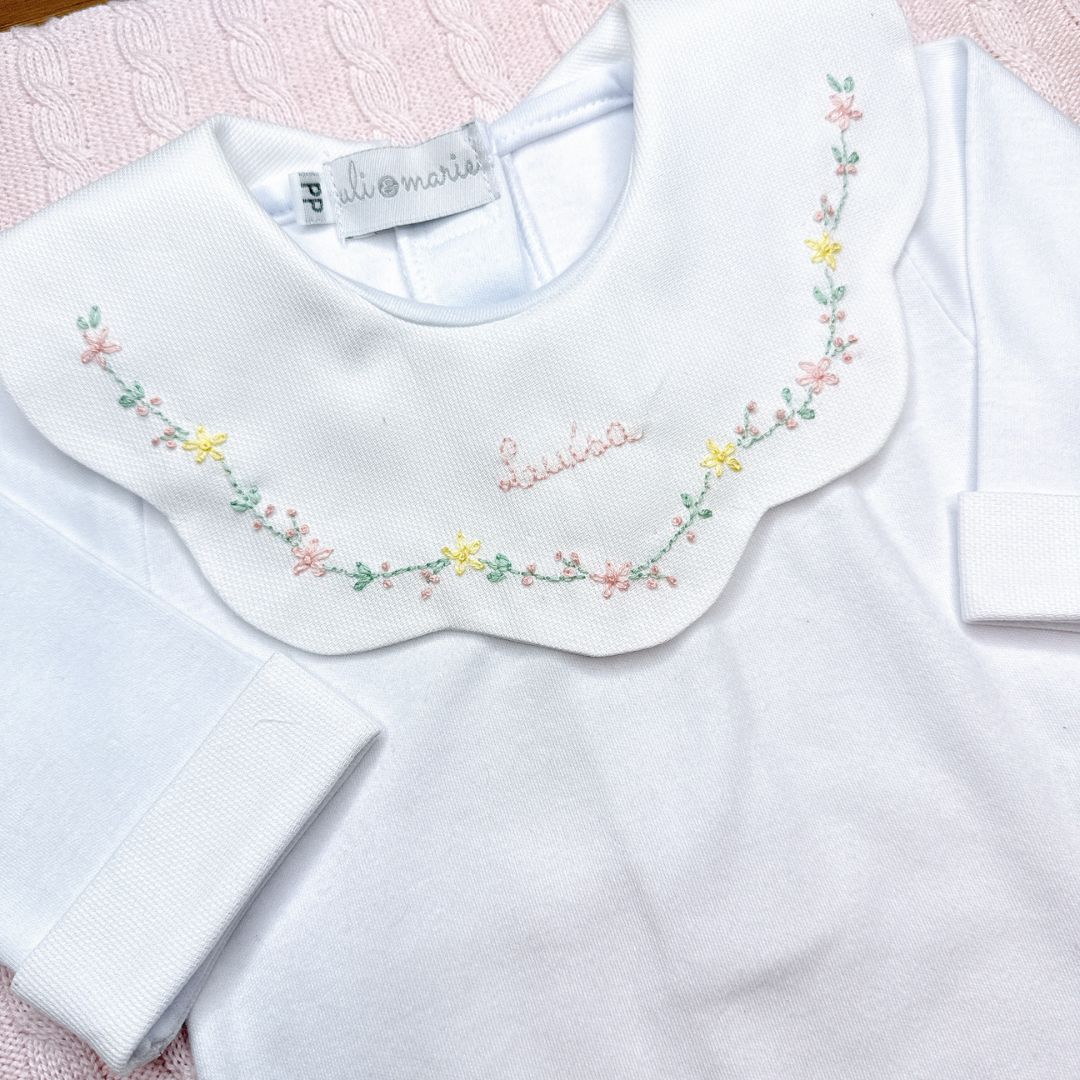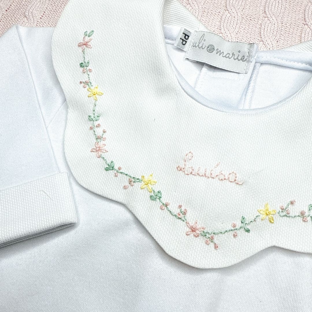O Body Personalizado Encanto Bordado à Mão da Uli&Marie é uma peça exclusiva e delicada, feita com todo o carinho para deixar os primeiros momentos da sua bebê ainda mais especiais. A gola em formato de babado é bordada à mão com flores em tons suaves e com o nome da sua bebê. Um toque artesanal que transforma o primeiro enxoval em uma verdadeira lembrança de amor.