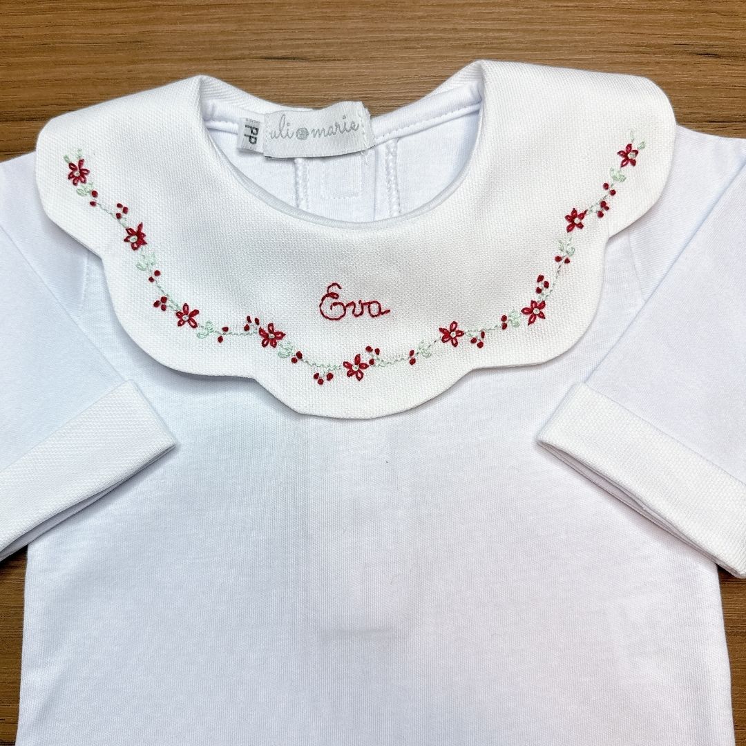 O Body Personalizado Encanto vermelho Bordado à Mão da Uli&Marie é uma peça exclusiva e delicada, feita com todo o carinho para deixar os primeiros momentos da sua bebê ainda mais especiais. A gola em formato de babado é bordada à mão com flores em tons suaves e com o nome da sua bebê. Um toque artesanal que transforma o primeiro enxoval em uma verdadeira lembrança de amor.