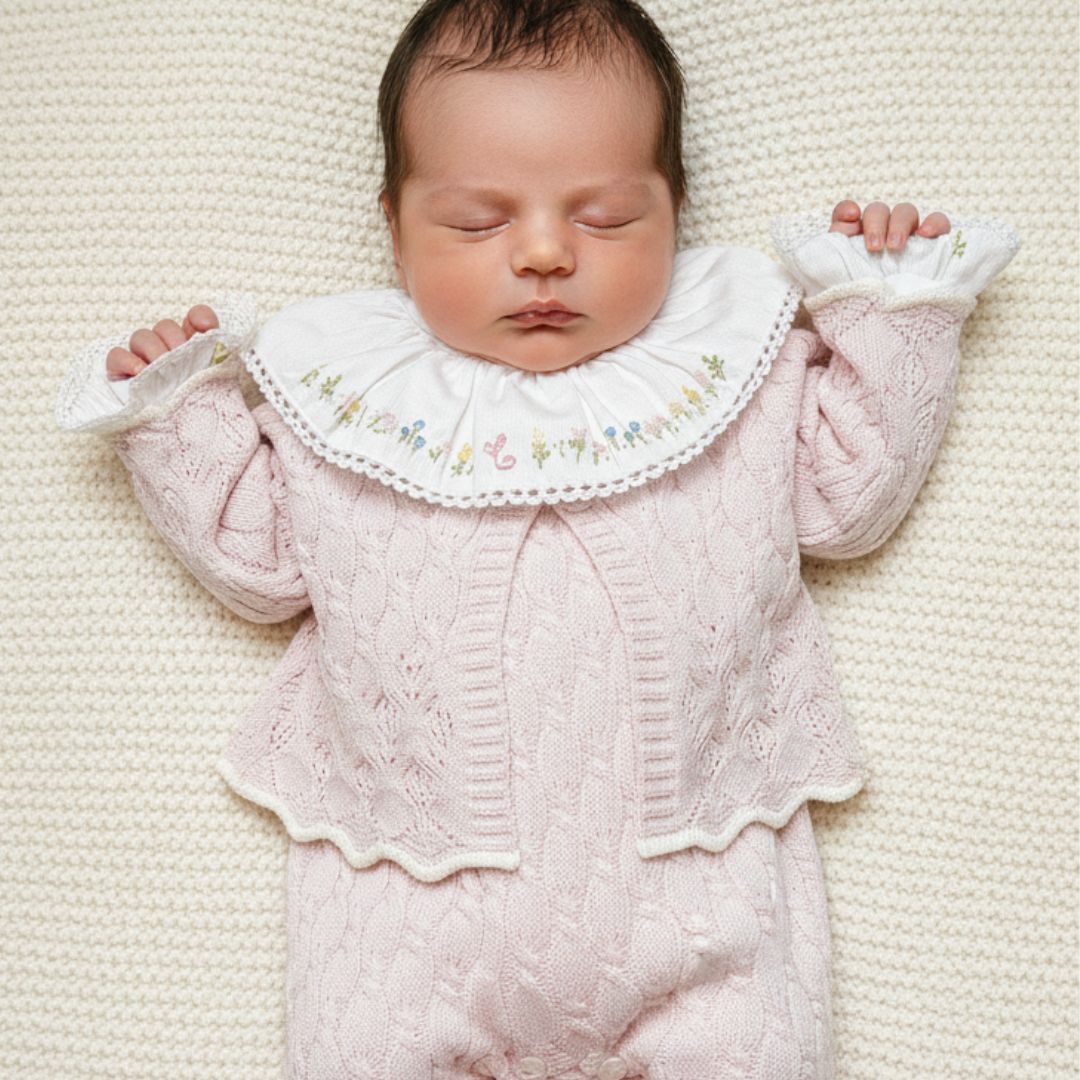A Saída Maternidade Julieta, na delicada cor rosa bebê, é mais uma peça encantadora do mix exclusivo da Uli&Marie.
