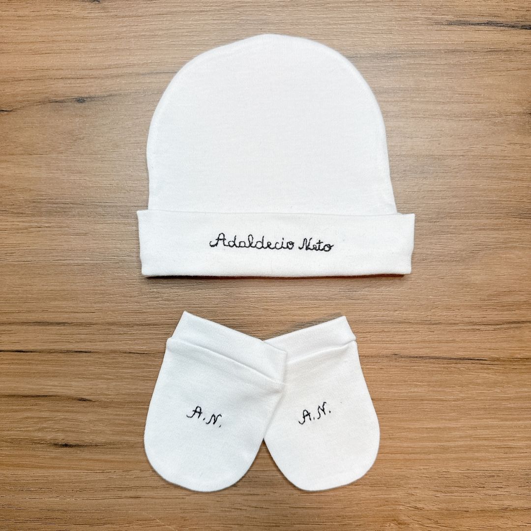 Nos primeiros dias de vida, o gorro e as luvas são indispensáveis para proteger a cabecinha do bebê do frio e evitar arranhões causados pelas unhas afiadas. Além de serem funcionais, essas peças são personalizadas, tornando o momento ainda mais especial.