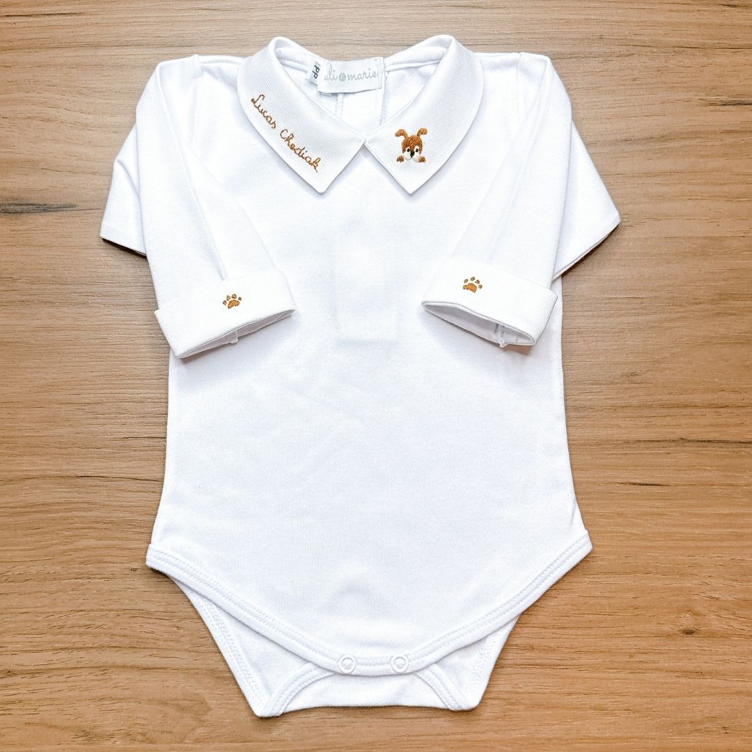 Body com gola bordada à mão com um charmoso cachorrinho e o nome do bebê;