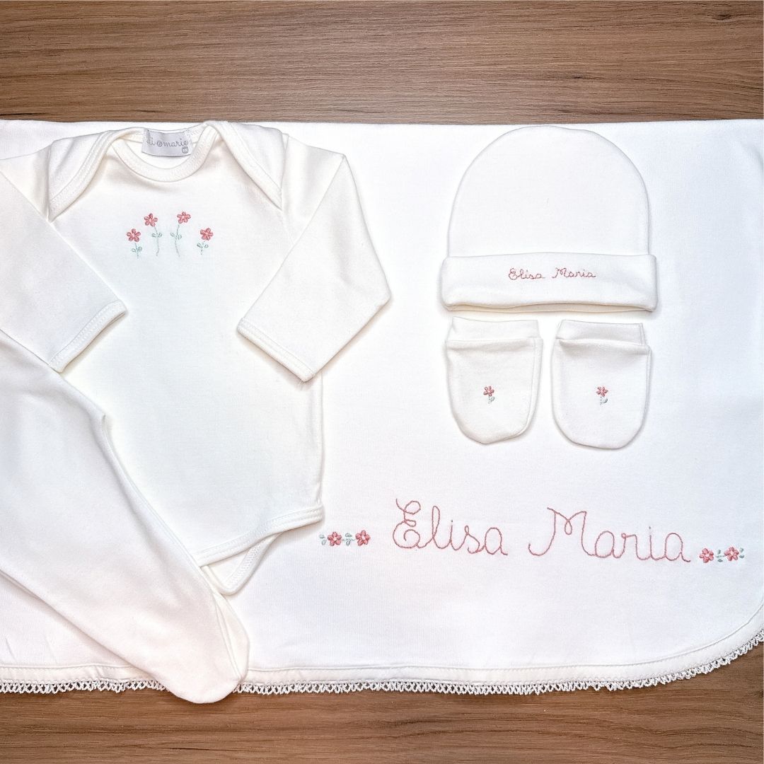 INFORMAÇÃO MUITO IMPORTANTE: Este kit é produzido sob encomenda e leva 20 dias para confecção, além do prazo de envio da transportadora. As peças são bordadas à mão, garantindo exclusividade e delicadeza.