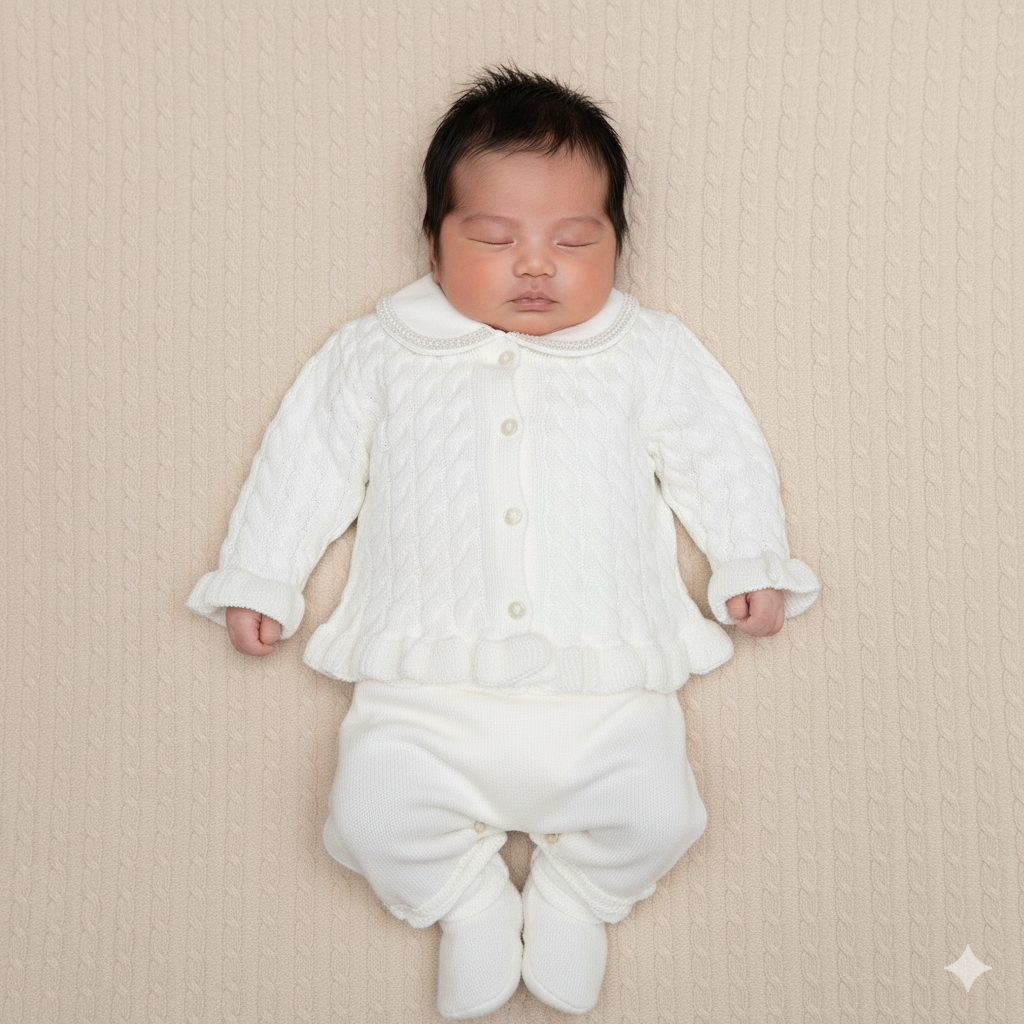 A Saída Maternidade Manu na delicada cor branca é uma escolha perfeita para tornar os primeiros dias do seu bebê ainda mais especiais. Este kit exclusivo da Uli&Marie inclui 3 peças essenciais: Jardineira, Casaquinho e Manta, criando um look completo, elegante e super confortável para a chegada do seu bebê.
