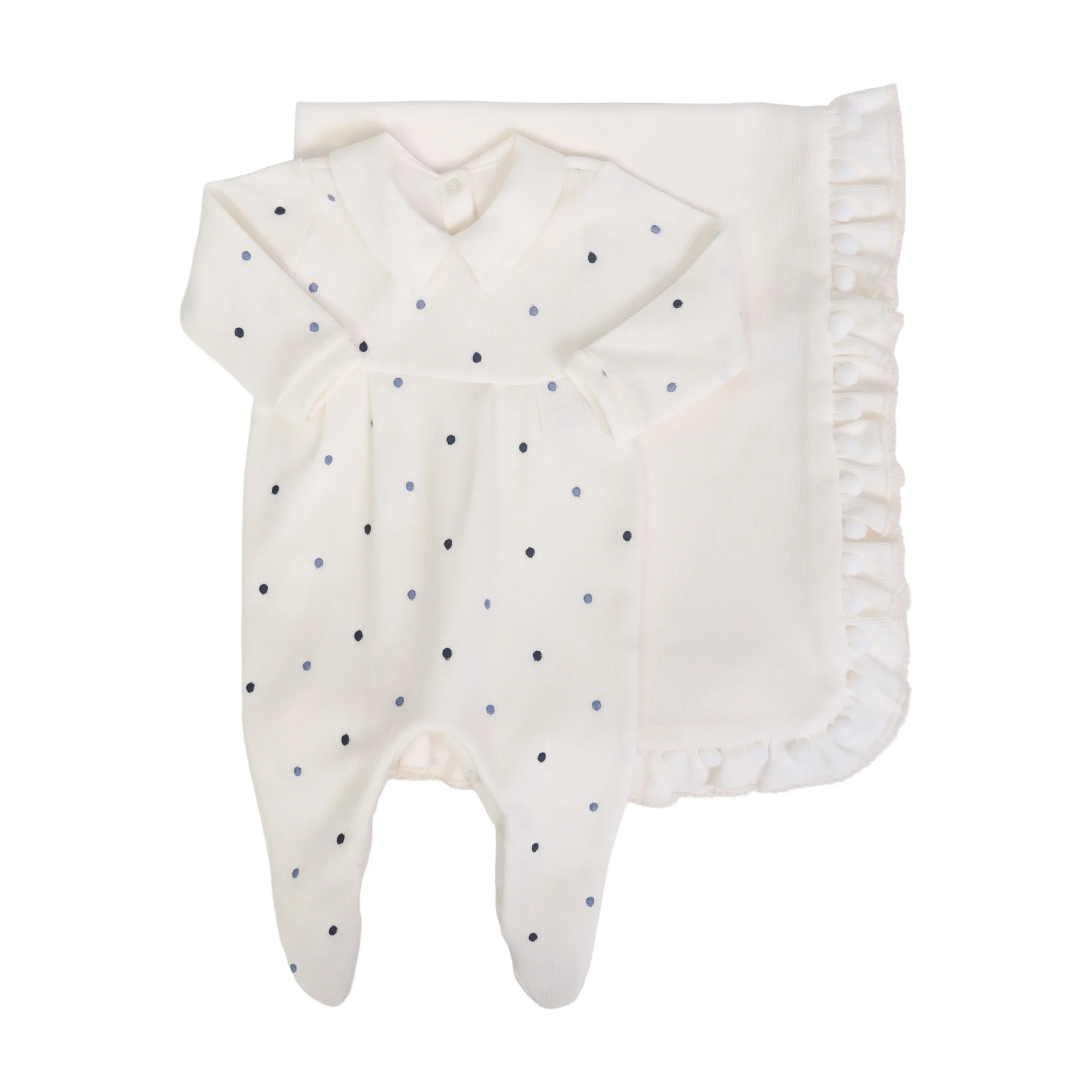 A Saída Maternidade Theo é a escolha ideal para mamães que desejam praticidade, conforto e sofisticação no primeiro look do bebê. Composta por duas peças – um macacão e uma manta combinando –, esse conjunto proporciona um visual harmonioso e encantador.